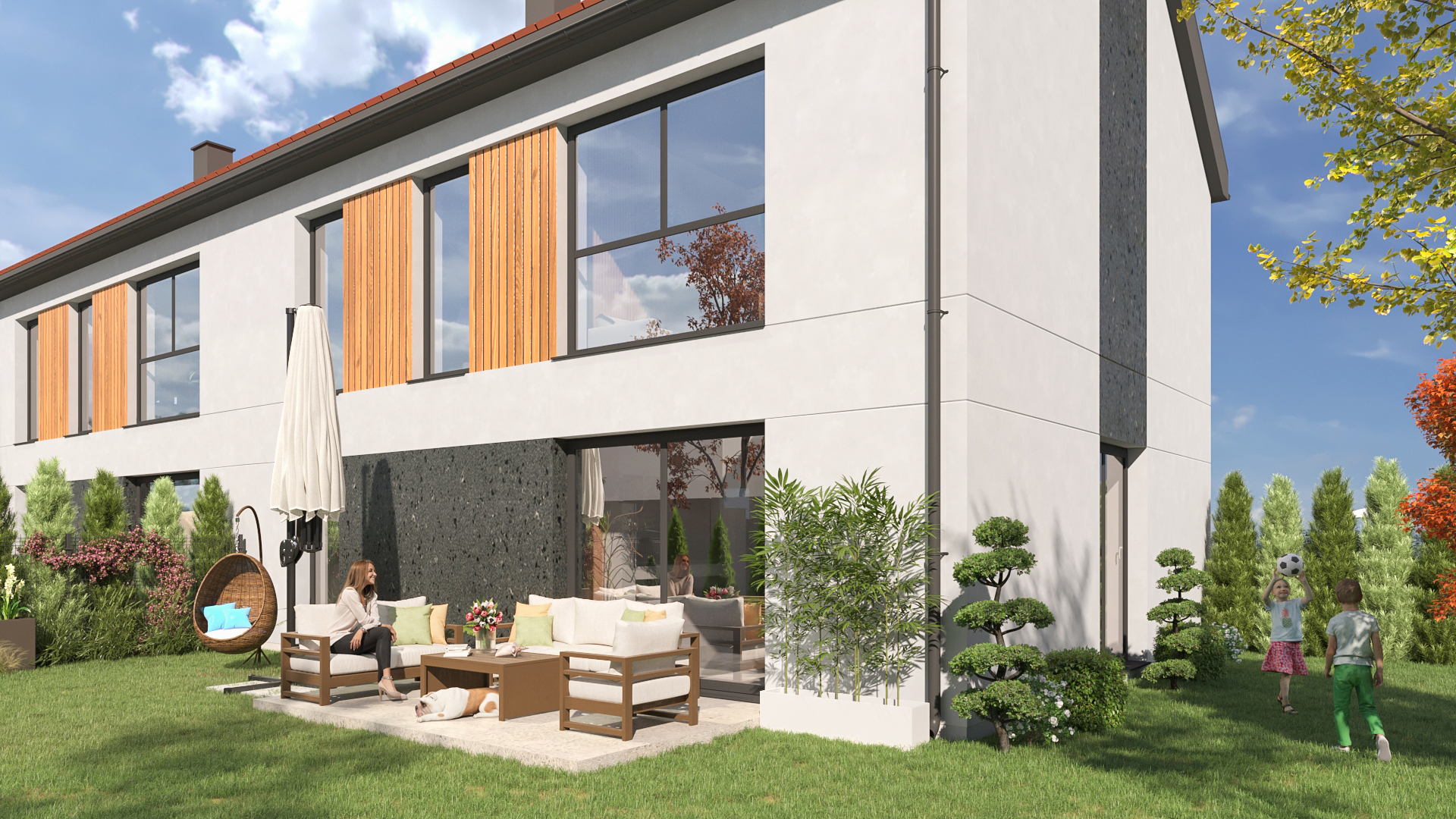 Każdy lokal posiada taras z płyt betonowych w ogrodzie, tworzący gotową przestrzeń do wypoczynku.